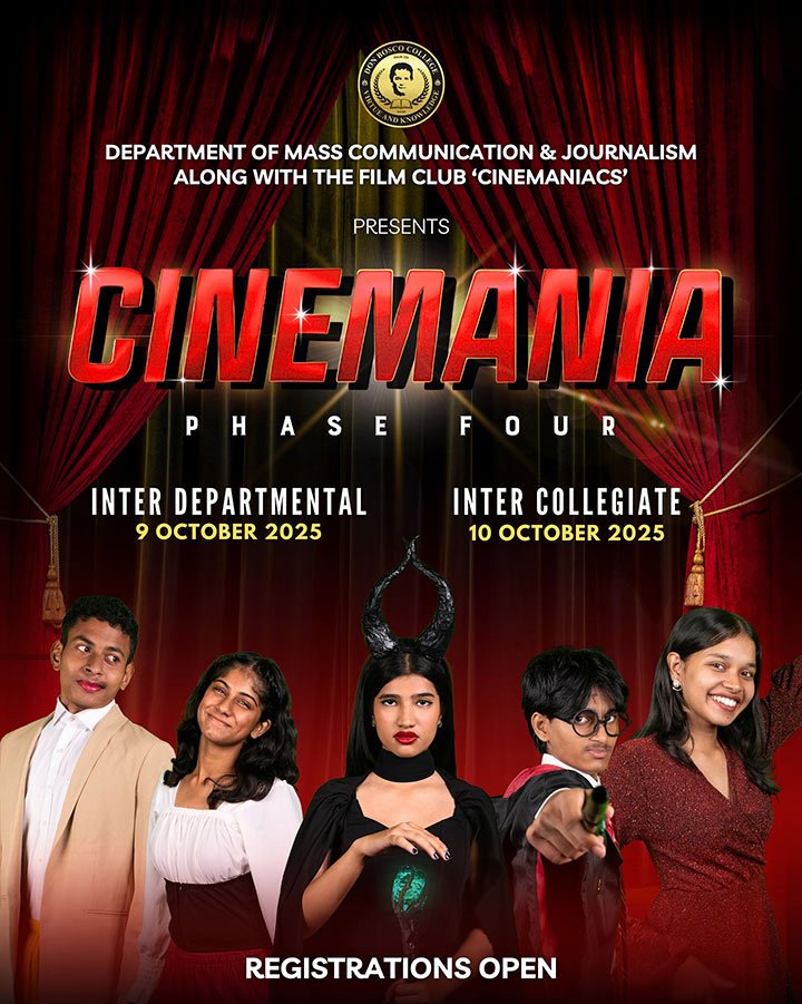 Cinemania is Don Bosco College, Panjim’s flagship annual intercollegiate festival dedicated to the world of cinema, creativity, and performance. Organized by the Department of Mass Communication and Journalism along with the Cinemaniacs Film Club, the event brings together students from across Goa to celebrate the magic of films through competitions, performances, workshops, and interactive sessions.